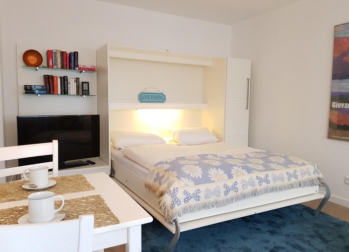 Diese gemütliche Einzimmerwohnung lässt Ihnen durch das bequeme Wandklappbett (2*90cm x 2,00m ) viel freien Raum zum Erholen.