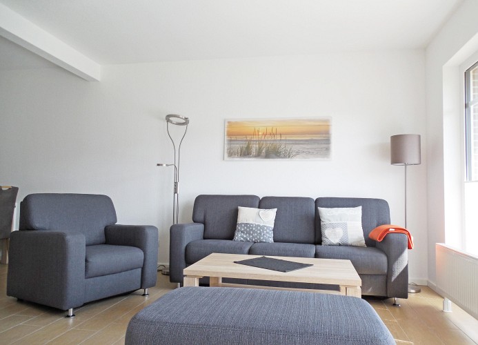 Das Haus verfügt über ein Schlafzimmer mit Doppelbett und 1 Kinderzimmer mit 2 Einzelbetten. Das Wohnzimmer vor der Südterrasse bietet ausreichend Platz für die ganze Familie.